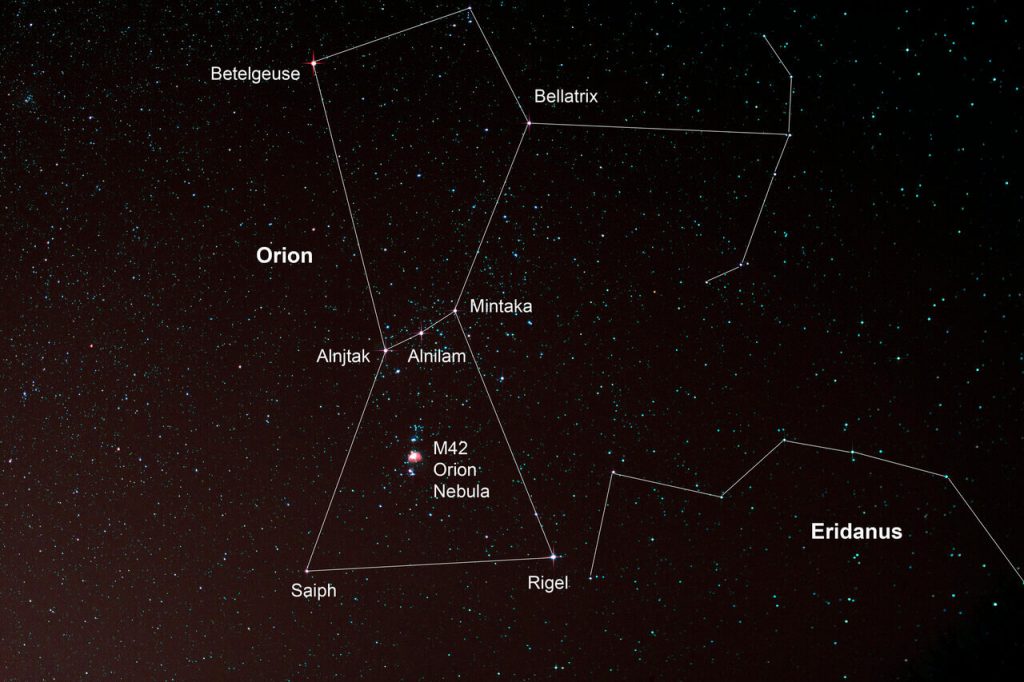 Orion's constellation consists of 81 stars - 7 main stars and a huge red one, named Betelguese. The brightest star in Orion is Rigel; however, Betelgeuse occasionally outshines it. -The three stars that form Orion's Belt are called Alnilam, Mintaka, and Alnitak.